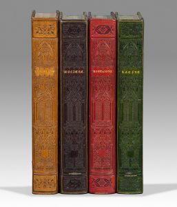 Un volume. Ensemble 4 volumes grand in-8, demi-veau fauve (aubergine, vert, rouge), dos entièrement couvert d’un décor à la cathédrale frappé à froid, tranches marbrées