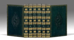 6 volumes in-8, veau bleu, filet doré et roulette palmée à froid, grande plaque losangée à froid au centre, dos orné, roulette intérieure, tranches marbrées (Reliure de l’époque).
