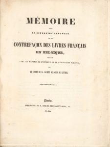 ▬ Mémoire sur la situation actuelle de la contrefaçon des livres français en Belgique. Paris, Brière, 1841 (pp. 3-34).