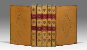 5 volumes in-8, veau blond glacé, encadrement et losange central dessinés par un filet noir, point doré à l’intersection des filets, dos orné d’un fer noir répété, palette dorée et pièces de titre rouges, dentelle intérieure, tranches dorées (Thouvenin).