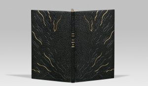 In-12, maroquin noir, décor à froid évoquant des flammes, quelques éléments au filet doré, dos lisse portant le titre doré, doublure bord à bord du même maroquin frappé à froid d’un décor dans le même style, gardes de soie rose pâle, tranches dorées, couverture et dos, chemise demi-maroquin noir, étui (J. Anthoine-Legrain, 1949).