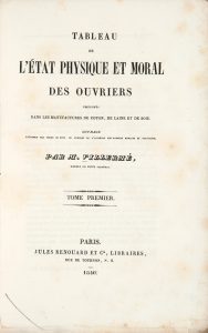 VILLERMÉ (Louis-René). Tableau de l'état physique et moral des ouvriers employés dans les manufactures de coton, de laine et de soie. Paris, Jules Renouard et Cie, 1840.