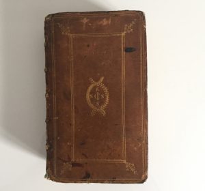 Rel. postérieure ancienne plein veau, fer monogrammé "IC" entouré de S barrés, et de branches de laurier, encadré de filets avec fleurons, dos à nerfs, caissons ornés, tranches dorées. Tampon E. L. de P. Brauman, Coins et dos abîmés, manques en coiffe, dos passé, contre-garde absentes. Intérieur en très bonne condition, à l'exception d'une tache d'encre sur la p.d.t. qui à traversé les deux premiers ff., d'une petite greffe de papier sur la p.d.t., et de rares rousseurs marginales.