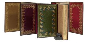 Lemerre, 1872-1895. Ensemble 4 volumes grand in-8, maroquin janséniste ébène, brun ou vert, dos à 5 nerfs, doublures de maroquin rouge, vert olive, vert lierre et lie de vin avec riches encadrements floraux aux filets et fers spéciaux dorés et fleurs mosaïquées de différents tons, gardes de soie brochée, doubles gardes, tranches dorées sur témoins, couvertures (Marius Michel). EDITION ORIGINALE ou en partie originale. Portrait-frontispice gravé sur cuivre par Rajon dans Poèmes antiques. Tirages sur Hollande, respectivement limités à 100, 100, 30 et 50 exemplaires. Ces quatre volumes sont enrichis de deux lettres autographes signées. La première (une page in-8), datée 29 mai, dans laquelle il demande qu’on lui adresse une seconde épreuve de son poème « Pantouns Malais » afin qu’il en corrige la ponctuation. La seconde (3 pages in-8), adressée à Mademoiselle Leonide Sers, datée 1er février 92, dans laquelle il s’excuse de ne pouvoir intervenir auprès des ministres actuels mais l’assure que s’il peut être utile à un moment ou à un autre il n’y manquera pas. Il l’informe de sa mauvaise santé et lui demande des nouvelles d’Emilie, de Mme Foucque et de Paule. Superbes reliures, malgré le dos du volume Derniers poèmes un peu passé, quelques feuillets brunis dans Poèmes tragiques et pâles rousseurs dans Poèmes antiques.