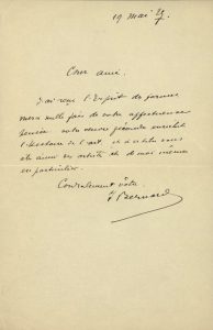 ▬ Boulogne-Billancourt, 26 janvier 1926. « Vous m'avez fait la bonne surprise de m'envoyer votre récent ouvrage. J'en lis quelques pages après mon labeur. Quand j'ai la journée entière imaginé, créé des images selon mon rêve de vie, je rentre avec vous dans une pensée circonscrite et inattendue sur des sujets éternels... »