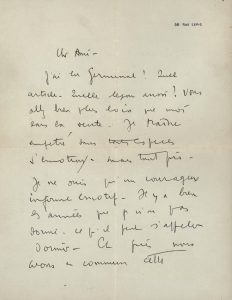 Je ne suis qu'un courageux infirme émotif. Il y a bien des années que je n'ai pas dormi, ce qu'il peut s'appeler dormir. Et puis nous avons en commun cette conscience de la brièveté de notre miracle personnel, de notre incroyable fragilité. Les autres parlent comme des bûches. Ils ne "savent" pas. Nous, Élie, nous "savons" que ce qu'ils racontent n'a pas de sens – aucun sens. Ils meurent sans le savoir. Bien affectueusement... Je téléphone lundi. »