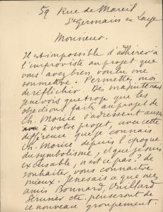 « Il est impossible d'adhérer à l'improviste au projet que vous avez bien voulu me soumettre. Permettez-moi de réfléchir. Dès maintenant, je ne vois que trop que les objections faites au projet de Ch. Morice s'adressent aussi à votre projet, avec cette différence que je connais Ch. Morice depuis l'époque du symbolisme, et que je suis excusable, n'est-ce pas ? de souhaiter vous connaître mieux.