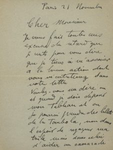 « Je vous fais toutes mes excuses du retard que je mets pour vous dire que je tiens à m'associer à la bonne action dont vous m'entretenez dans votre lettre. Voulez-vous me dire où et quand je dois déposer mon tableau et où je pourrai prendre des billets de la tombola, non dans l'espoir de regagner ma toile mais dans celui d'aider un camarade en risquant la chance d'une bonne fortune... »