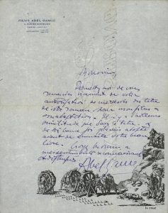 Sur un feuillet à en-tête imprimé des « Films Abel Gance » avec bas de page illustré d'une reproduction de gravure ancienne représentant des scènes de torture avec roues. – Élie Faure avait fait paraître en 1919 un roman intitulé La Roue, et Abel Gance livrerait en 1923, sous le même titre, un de ses films majeurs.