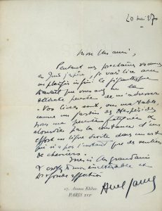 « Mon cher ami, pendant mes prochaines vacances, en juin, j'espère, je vais lire avec un plaisir infini le gigantesque travail que vous avez eu la délicate pensée de m'adresser. Vos livres sont, sur ma table, comme un jardin des Hespérides, pour ma pensée fatiguée & alourdie par la constance d'un effort en ligne droite dans un art qui n'a pour l'instant que des sentiers de chevriers... »