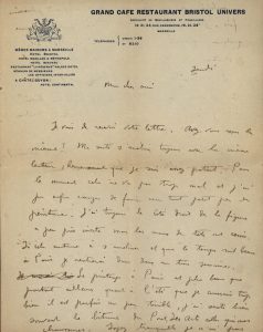 ▬ Marseille, « jeudi » [1919]. « ... Ma santé s'améliore toujours avec la même lenteur, heureusement que je suis assez patient. Pour le moment, cela ne va pas trop mal et j'ai pu enfin essayer de faire un tout petit peu de peinture. J'ai toujours le côté droit de la figure à peu près inerte mais les maux de tête ont cessés. Si cela continue à s'améliorer et que le temps soit beau à Paris, je rentrerai dans deux ou trois semaines [Albert Marquet avait été atteint de la grippe espagnole, et fut long à guérir].