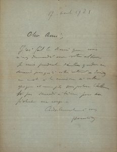 « J'ai fait le dessin que vous m'avez demandé sur votre album. Je crois prudent de garder ce dernier jusqu'à votre retour. Écrivez à la maison à cette époque et mon fils vous portera l'album [le futur galeriste Pierre Matisse].