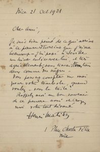 MATISSE (Henri). Lettre autographe signée à Élie Faure. Nice, 21 octobre 1921. 1 p. in-8, enveloppe, quelques rousseurs.