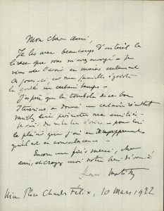 je lis avec beaucoup d'intérêt le livre que vous m'avez envoyé [Élie Faure a publié et préfacé plusieurs ouvrages en 1921 et 1922].