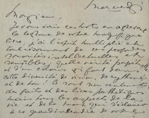 ▬ Paris, « samedi » [1905]. Sur Velázquez, d'Élie Faure (1904). « Je n'ai pu vous remercier plus tôt, étant souffrante, du beau livre que vous m'avez adressé, et où j'ai appris tout Vélasquez, si puissant, héroïque, lumineux et mystérieux, si visible au travers de l'admirable et lucide émotion que vous avez mis à nous le faire connaître... »