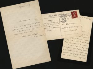• une lettre et deux cartes de la mère de Charles-Louis Philippe, adressées à Élie Faure (1910 et s.d., les cartes postales portant au recto une vue photographique du monument funéraire de Charles-Louis Philippe).