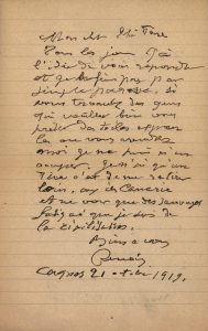 RENOIR (Auguste). Lettre autographe signée « Renoir » à Élie Faure. Cagnes-sur-Mer, 21 octobre 1919. 1 p. in-8.