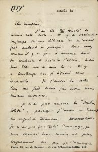 « ... Si vous voulez ne compter cette année, bientôt, de silence que pour une inconcevable faiblesse et me donner l'occasion un jour d'avoir la joie de vous connaître, je vous en serais reconnaissant. Vous savez que c'est en toute sincérité que je vous admire, que je vous cite, depuis de nombreuses années. Je ne viens à Paris, pour la Nrf, que le mercredi et je suis si bousculé toute la journée qu'il m'est difficile de trouver un moment de calme. J'habite Compiègne le reste de la semaine. Si le voyage ne vous effrayait pas... je vous demanderais de venir passer la journée ici. J'habite tout auprès de la forêt qui est magnifique. Nous irions parler sous les arbres... (Vous disiez excellemment dans votre lettre "poètes du pinceau ou du crayon" et non peintres. Oui, c'est bien cela, mais ils n'ont jamais l'air de le savoir.)... »