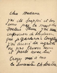 SOUTINE (Chaïm). Lettre autographe signée « Ch. Soutine » à la veuve d'Élie Faure, Suzanne Gilard. S.l., [vers la fin d'octobre ou le début de novembre 1937]. 1 p. in-12.