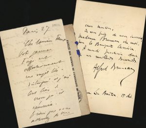 ▬Joint, 4 brouillons de lettres (3 autographes signées, une autographe) d'Élie Faure à Georges Buraud, dont une évoquant Abel Gance auprès de qui Georges Buraud travailla comme assistant. ▬ CHARPENTIER (Gustave). Carte autographe signée. Agay (Var), 24 novembre 1904. Le compositeur et chef d'orchestre dit accepter l'invitation au banquet organisé par Élie Faure en l'honneur du peintre Eugène Carrière, qui se déroulerait le 20 décembre 1904 sous la présidence de Rodin.