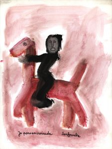 32x24 cm, aquarelle avec détails au feutre. « Je pars en croisade ». Cavalier noir sur monture de feu.
