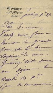 « Voulez-vous faire à Monet la grande joie et la bonne surprise de venir à Giverny ? Soit dîner ou déjeuner le mardi 14 9bre (jour de son anniversaire ? Si oui, comme je l'espère, tâchez donc d'amener avec Mr Descaves [l'écrivain Lucien Descaves] qui passant cet été nous avait promis sa visite... »