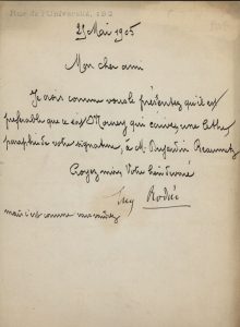RODIN (Auguste). Lettre signée à Gustave Geffroy. Paris, 25 mai 1905. 3/4 p. in-12, en-tête imprimé à son adresse du 182 rue de l'Université, enveloppe.