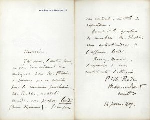 • une lettre autographe signée de Maurice Baud adressée au même, en qualité de secrétaire de Rodin (14 janvier 1909) :