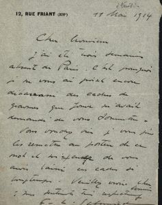 « J'ai été trois semaines absent de Paris. C'est pourquoi je ne vous ai point encore débarrassé des cadres de gravures que Jouve m'avait demandé de vous soumettre.