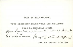 Vœux de nouvel an imprimés avec ajout autographe signé de la sculptrice Chan May-Kan (épouse de Zao Wou-Ki) complété par le peintre qui a ajouté sa propre signature.