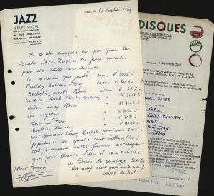 ▬ 25 pièces adressées à Sidney Bechet, essentiellement des contrats signés par des gérants d'éditions musicales (Eddy Barclay pour Blue star puis pour lui-même, Albert Ferreri pour Jazz-disques puis pour les éditions musicales Vogue, Léon Kaba pour Jazz disques), et de clubs de jazz (Charles Delaunay pour l'International Jazz parade, Jeanine Senneville pour le Club du Vieux colombier), etc. Sont fréquemment précisés les morceaux concernés, dont Petite fleur (12 décembre 1952).