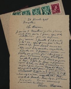 MESSIAEN (Olivier). Lettre autographe signée à Jean Hesse. Bruxelles, 20 novembre 1945. 1 p. in-8, enveloppe.