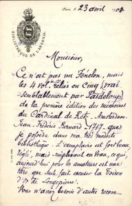 L'exemplaire est fort beau, réglé, mais simplement en veau, ce qui, aujourd'hui pour les amateurs est une tare que seule fait excuser la Toison d'or de Longepierre... Les magnifiques livres de l'Arsenal sont à votre disposition et l'administrateur [Heredia lui-même] serait très heureux de vous faire les honneurs des nouvelles salles et de vous entretenir de ses projets d'embellissement pour mieux faire valoir tant de merveilles... »