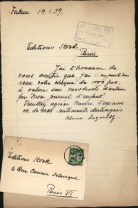 « J'ai l'honneur de vous avertir que j'ai aujourd'hui reçu votre chèque de 1000 frcs, à valoir sur mes droits d'auteur po[u]r "Mon Journal d'enfant"... »