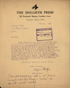 WOOLF (Virginia). Lettre signée avec 2 lignes 1/2 autographes. London, 8 janvier 1930. 1 p. in-folio, en-tête imprimé des éditions The Hogarth Press, quelques fentes marginales.