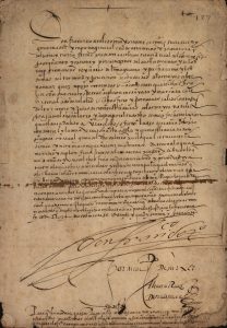 TOLEDO (Francisco Álvarez de). Pièce signée en qualité de vice-roi du Pérou, contresigné par son secrétaire d'État Alvaro Ruiz de Navamuel y de Los Rios. Los Reyes [Lima], 12 septembre 1577. 1 p. in-folio, petite déchirure marginale...