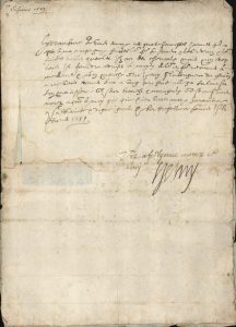« Harambure, je vous envoye ces quatre honnestes hommes pour estre de ma compagnye. Faictes leur faire le sarmen & les retenez & leur faictes bailler quartier. Ilz on des chevaulx, mais non trop bons ; il fauldra adviser le moyen de leur en faire recouvrer de meilleurs & a bon marché, car je croy que la longueur du chemin à me venir trouver leur a ung peu faict alleger la bourse. L’on m’a asseuré qu’ilz sont braves & courageulx. C'est ce que vous aurez à present de moy qui prie Dieu vous avoyr, Harambure, en sa saincte & digne garde... »