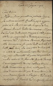 « ... Son venute le copie di due famosi decreti della Convenzione. Il primo, ch'è del 23 dello scorso maggio, è stato provocato da un sanguinario discorso, e mozione, e mozione del cittadino Barrère, deputato alla Convenzione. In virtù dell'articolo 4to, tutti li Corsi che sono stati dichiarati in istato di controrivoluzione dai commissari, sono condannati ad essere trasportati nelle carceri di Francia.