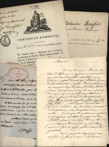 ▬ Fiaud (lettre à l'abbé Henri Grégoire pour lui proposer une grammaire et un dictionnaire Quechua manuscrits établis par le mathématicien et astronome Louis Godin, qui, membre de l'expédition de La Condamine en Amérique du Sud, y est ensuite resté quinze ans), ▬ le naturaliste Bernard-Germain de LACÉPÈDE (en qualité de grand-chancelier de la Légion d'Honneur),