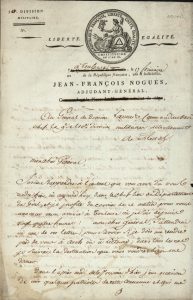 « ... Dans l'après-midi de la journée d'hier, j'eus l'occasion de voir quelques patriotes de cette commune et qui me paroissent vous être on ne peut pas plus attachés ; j'ai été bien aise de les rassurer sur les bruits allarmants que la malveillance s'étoit plue à répandre ici sur