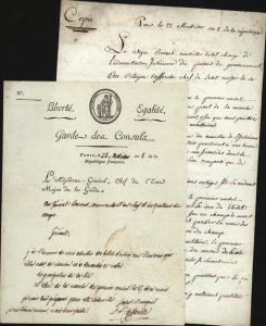 Invitation à la fête du 14 juillet au palais des Tuileries, comprenant une lettre du futur Général Caffarelli, et un programme des festivités présidées par Bonaparte établi par le conseiller d'État Pierre Bénézech, inspecteur du palais des Tuileries où il tenait lieu de maître des cérémonies.