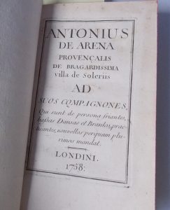 ARENA (Antoine) - Antonius de Arena provencalis de Bragardissima villa de Soleriis ad suos compagnones qui sunt de persona friantes, bafsas, dansas et branlos practicantes nouvellos perquam plurimos mandat – Londres, 1758 – In-12 : [6] dont le...