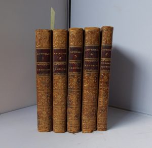 5 volumes (/6) veau ancien, triple filet doré autour des plats, dos lisse orné, p. de titre grenat, tr. chinées.