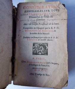 SANTIAGO (Hernando de) - Considérations admirables sur tous les évangiles des dimanches & fériés du Caresme trad. en français – Paris, Nicolas Du Fossé, 1605 – Deux parties en un fort volume in-8 : 736 et 306 et table –