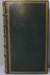 Reliure postérieure maroquin vert, triple filet doré autour des plats, dos orné à nerfs, titre et adresse dorés au dos, dentelle intérieure, filet sur les coupes, tr. dorées. (Trautz-Bauzonnet)