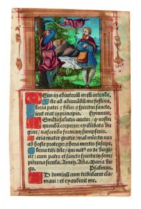 [HEURES]. - ENSEMBLE DE 2 FEUILLETS ESTRAITS D'UN LIVRE D'HEURES, comprenant deux gravures sur bois enluminées. 2 feuillets 144 x 94, sous passe-partout.