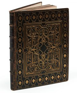 Maroquin brun, plats ornés d'un entrelac de doubles filets et de fleurs de lys dorés encadrant un décor de rinceaux à la manière des décors du XVIe siècle, dos à nerfs orné, dentelle dorée intérieure, tranches dorées (Gruel).