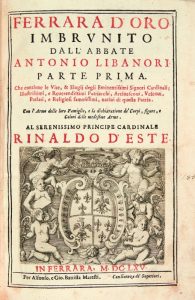 LIBANORI (ANTONIO) - Ferrara d'oro imbrunito dell' abbate Antonio Libaroni. Parte prima [- terza].Ferrare : Alfonso et Gio. Battista Maresti, 1665-1674. 3 parties en un volume in-folio, 310 x 214 : (9 ff.), 174 pp., (1 f. blanc) ; (6 ff.), 128...