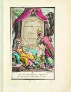 Exemplaire ne comprenant que les 3 premiers volumes sur les 4 requis, orné de 3 jolis titres allégoriques, représentant l'Europe, l'Asie et l'Afrique, et 221 planches, le tout colorié à l'époque et gravé à la manière noir par Félix Mixelle (1763- 1837) d'après Jacques Grasset de Saint-Sauveur et Claude-Louis Desrais (1746-1816).