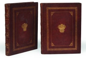 Cuir de Russie havane, succession de cadres de filets et roulettes dorées et à froid sur les plats, armes dorées au centre, dos à nerfs orné, roulette dorée intérieure, tranches dorées (reliure de l'époque).